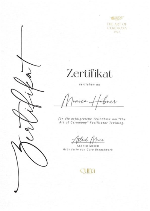Weiter führte mich mein Weg in der Ausbildung The Art of Ceremony - Training 2025 zum Erlernen von Kreieren von Zeremonien mit verschiedenen Ausrichtungen nebst vertiefen der Elemente "Holding Space" und traumasensitives Unterrichten.